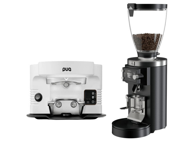 A precision-focused commercial bundle pairing the Mahlkönig E65W GbS grinder with the PUQpress Gen 5 M3 automatic tamper.
