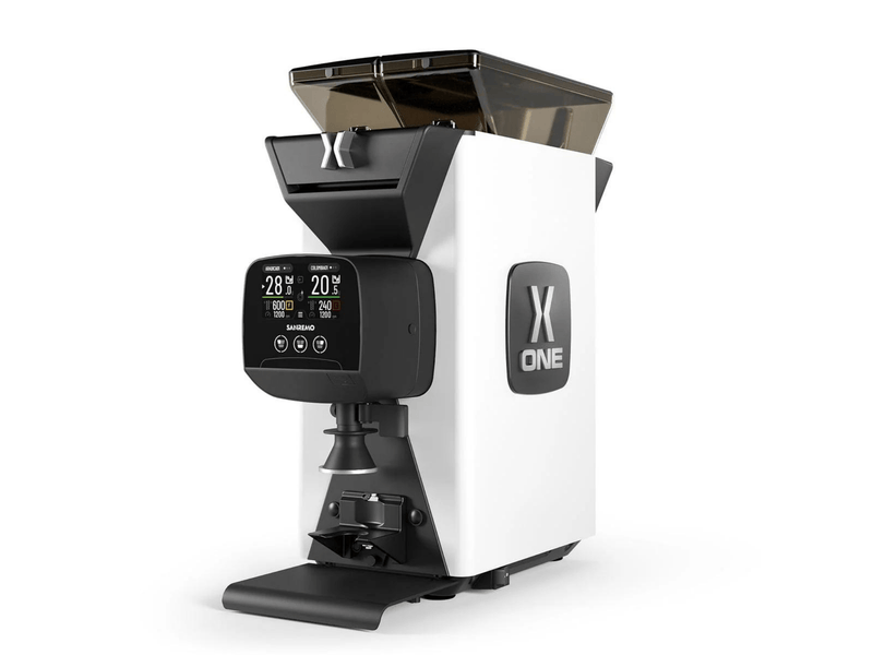 The Sanremo X-One is a precision grinder with 98 mm vertical flat burrs and a unique system that weighs beans before grinding. It features dual hoppers, a bypass for single-dose grinding, and customizable settings for consistent results, ensuring minimal waste and optimal aroma preservation.